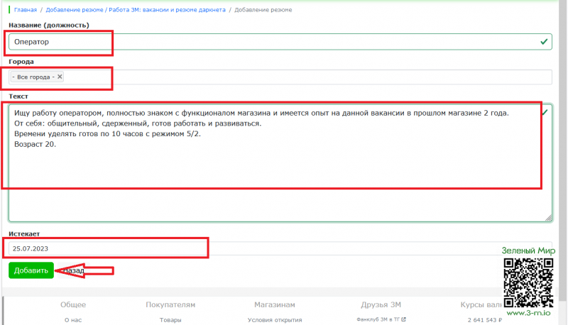 - После заполнения всех данных, кликните "Добавить" и ваше резюме будет добавлено на сайт.