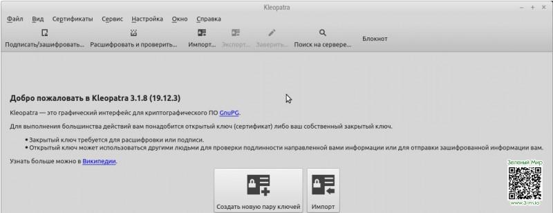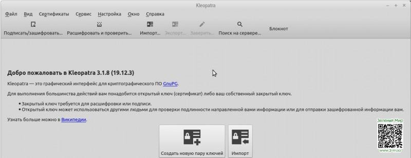 Для этих целей, дабы не было заморочек с терминалом(то есть консолью, её мало кто любит), мы будем использовать GUI ПО Kleopatra , которая и позволяет нам подписывать и шифровать файлы, а также обеспечивает создание, хранение и управление сертификатами и ключами шифрования.