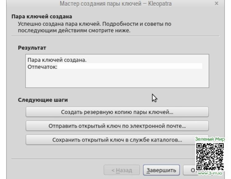 Далее мы создаем резервную копию пары ключей(пара ибо там ДВА ключа, приватный и публичный) и нажимаем кнопку "Завершить" (на вышеуказанной фотографии находится внизу, посередине).