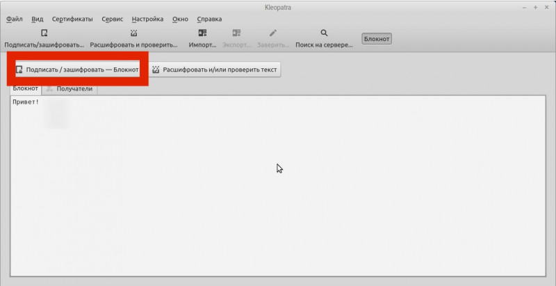 После ввода текста нажимаем кнопку "подписать / зашифровать - блокнот".