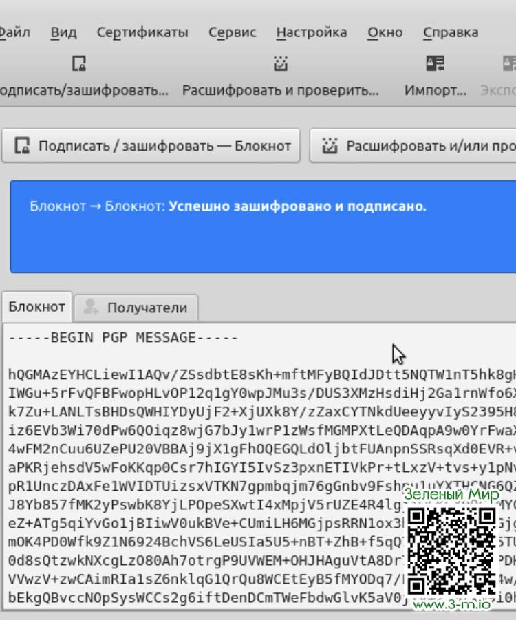 Сообщение в текстовом поле после слов "BEGIN PGP MESSAGE" и есть наша шифровка, которую нужно передать адресату.