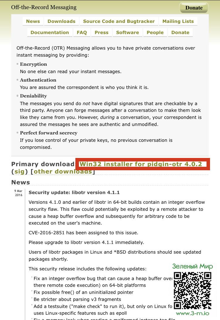 Дальше загружаем плагин защищенного соединения (OTR) pidgin-otr 4.0.2 отсюда: https://otr.cypherpunks.ca/ .