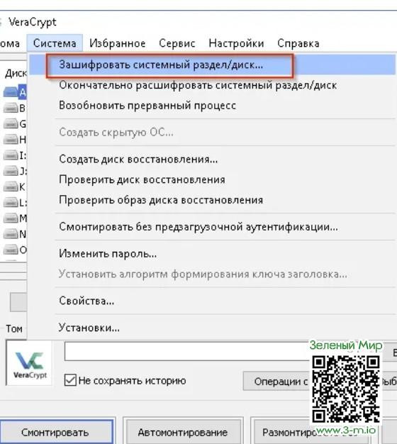 2. Открываем VeraCrypt , меню «Система», пункт «Зашифровать системный раздел/диск…»