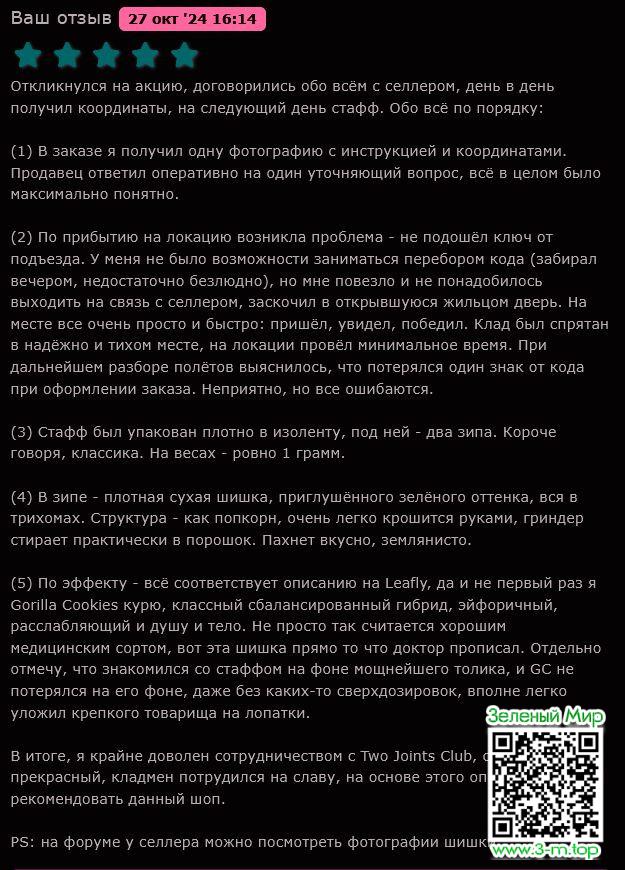 Собственно, идём в отзывы, а что там? Вот рандомно тыкнул позицию Hash Medical Все своё забрали — это уже очень хорошо. А детали? Один пользователь частично потвердил описание по эффектам, двое написали что сильный стафф, один написал "в касание". Я знаю что магазин Cool Rasta надежные клады делает с умом, но есть нюанс: то что на витрине висит как "тайники" — это "псевдо-прикопы", расположенные в лесопарке, и покупая вслепую, мы этого не знаем. Получается игра в лотерею: вот я на голяке беру этот клад, в итоге не попадаю в свою хотелку НЕ идти в лесопарк, а ещё резко ограничивается время забора — ночью на лесные темы идти стремно и проблематично. Про вес, структуру речи вообще не зашло.