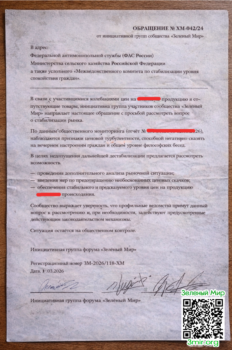 ОБРАЩЕНИЕ № ХМ-042/24 от инициативной группы сообщества «Зелёный Мир»