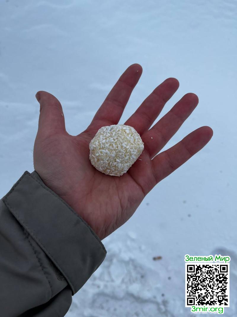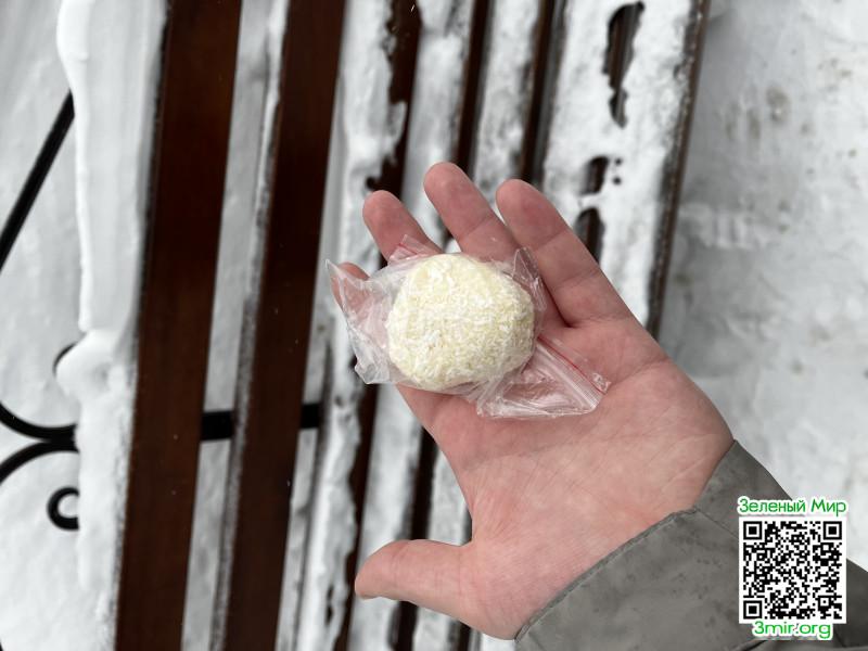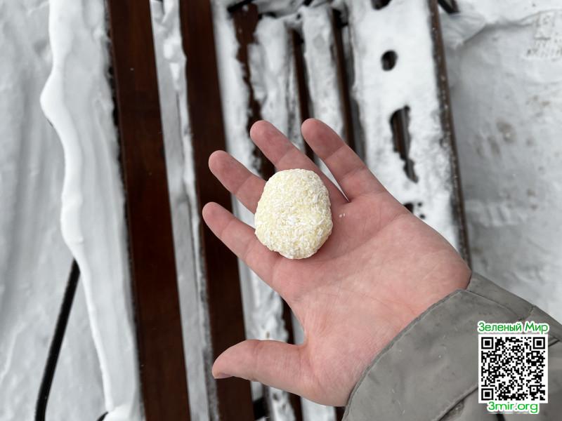 8:30 Проснулся и почти сразу съел конфету с чайком. По вкусу и правда напоминает рафаэлло, просто мягкий.