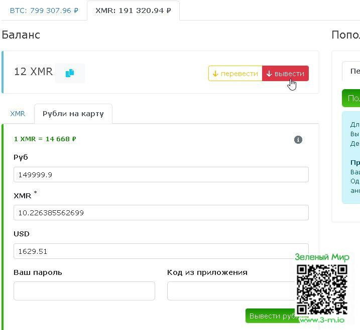 Вывод монеро в рубли на карту для тех, у кого включён вывод (сотрудники магазинов и 3М).