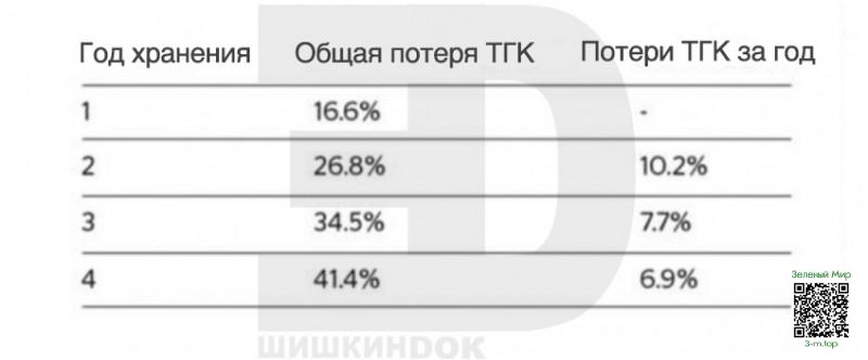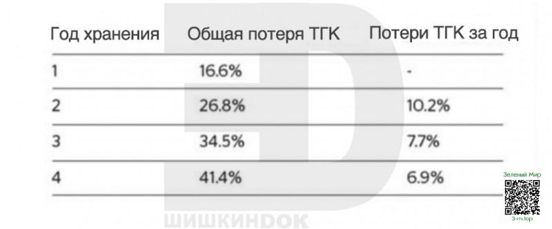 Исследования, проведенные в Университете Миссисипи на низкокачественном каннабисе, хранящемся в течение четырех лет при комнатной температуре (20-22°C), показали, что процент потери ТГК был пропорционален времени хранения, причем наибольшие потери приходились на первый год. По мере снижения уровня ТГК концентрация КБН увеличивается. Это исследование согласуется с опытом потребителей марихуаны.