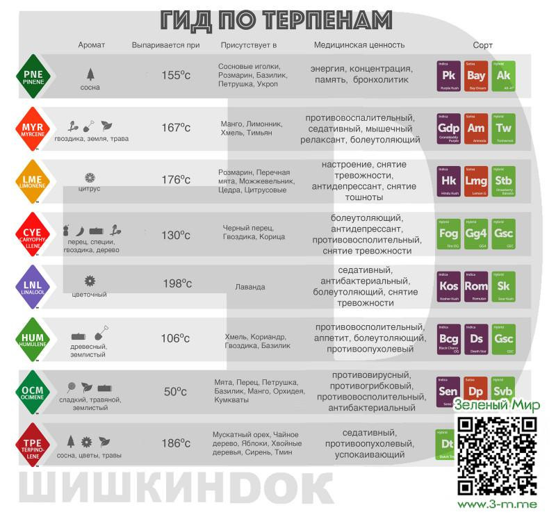 Конопля содержит в себе множество химических веществ и соединений. Ряд из них известны как терпены, которые принадлежат к большой группе ароматических органических углеводородов. Терпены – ароматные масла, которые выделяются вместе с другими биологически активными веществами, в том числе каннабиноидами. Они влияют как на вкус, так и на аромат соцветий, а ряд терпенов обладают лечебным эффектом. Они придают конопле отличительные ароматы ягод, сосны, цитрусовых либо мяты.