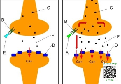 Изображение разницы между воздействием на рецепторы естественными каннабиноидами и ТГК. Справа накурен, слева нет.
